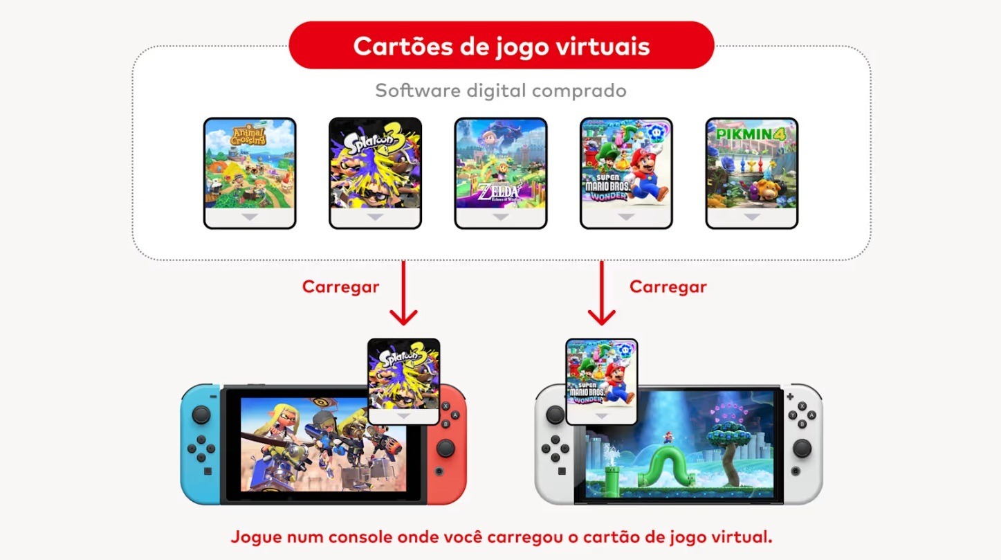Você pode carregar e ejetar virtualmente cartões de jogo virtuais entre até dois sistemas Nintendo Switch.