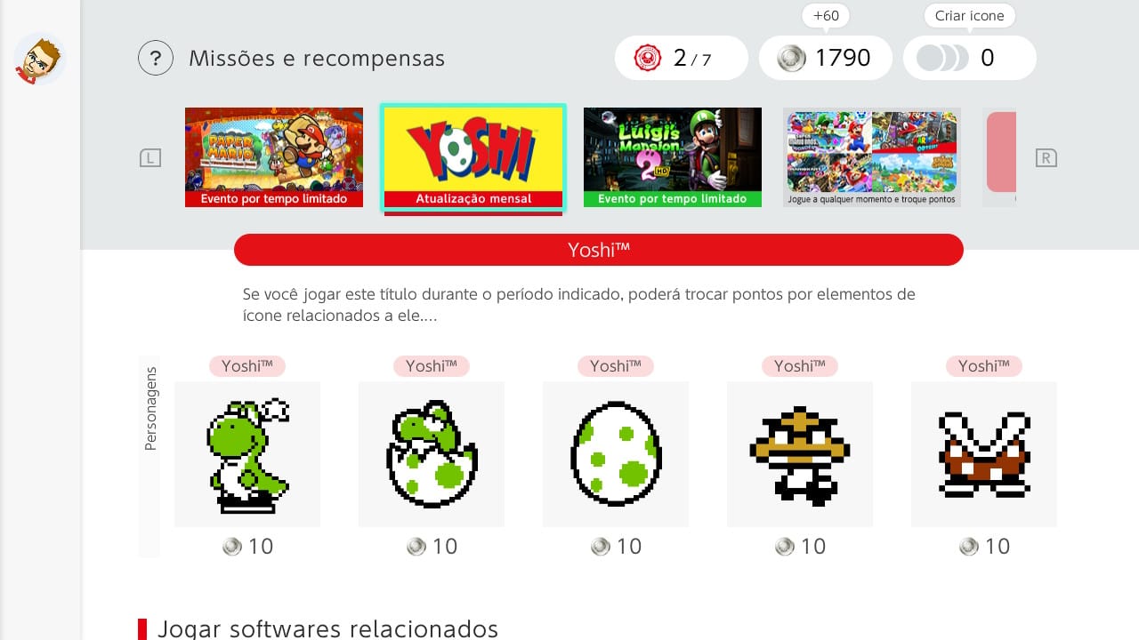 Para resgatar os ícones, basta acessar o APP do Nintendo Switch Online na tela principal de seu Nintendo Switch, acessar a opção 'Missões e Recompensas' e trocá-los por 10 moedas de platina para os personagen.