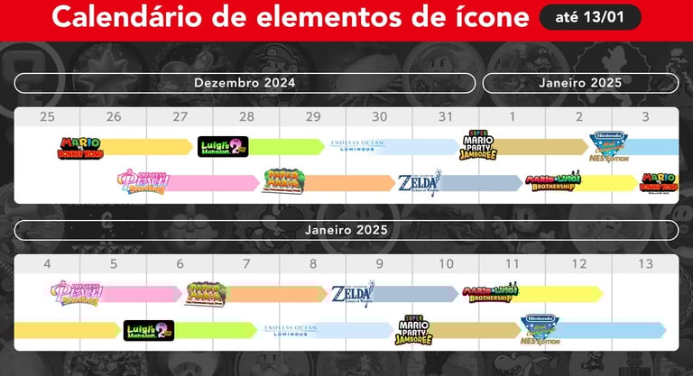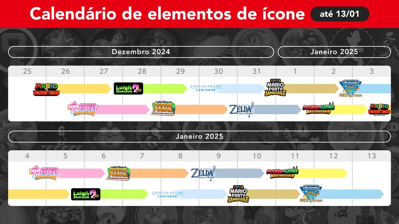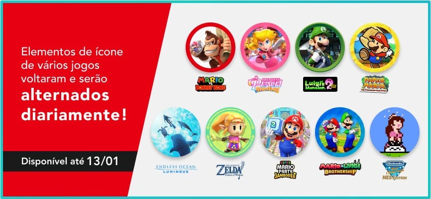 Nintendo está retornando com alguns ícones para os assinantes do Nintendo Switch Online por tempo limitado. São ícones de todos os jogos lançados no ano de 2024 e, caso você tenha perdido o prazo, aqui está uma segunda chance. O retorno começou no dia 25/12/2024 e finaliza no dia 13/01/2025.