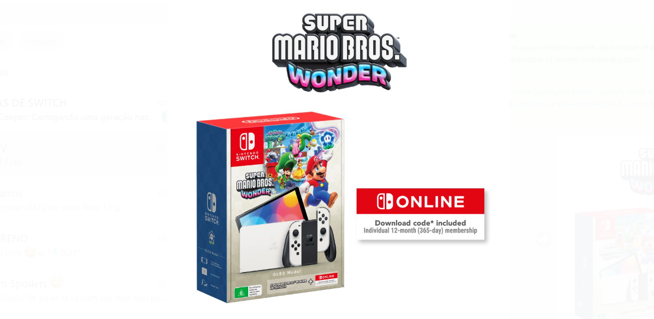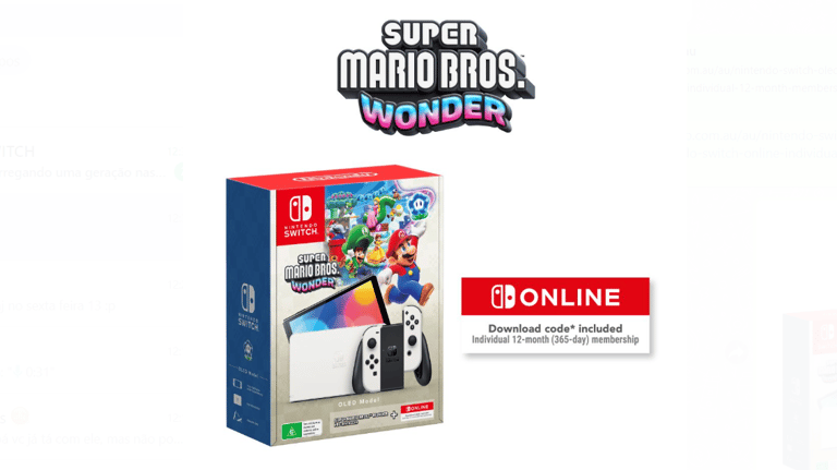 Esse pacote irá conter um Nintendo Switch Oled branco, uma cópia digital de Super Mario Bros. Wonder e 12 meses de assinatura do Nintendo Switch Online pacote básico. O valor do pacote custa o mesmo preço do Nintendo Switch Oled padrão, o que significa que o jogo Super Mario Bros. Wonder e a assinatura do Nintendo Switch Online saem de graça para o comprador.
