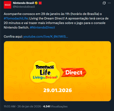 A Nintendo anunciou em suas redes sociais que fará uma Nintendo Direct dedicada ao jogo Tomodachi Life: Living the Dream em 29/01, às 11h no horário de Brasília.