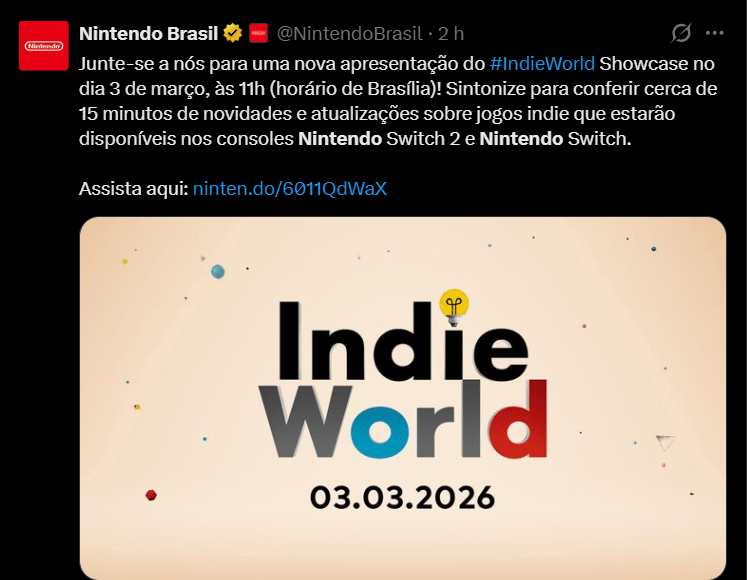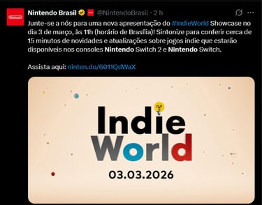 A Nintendo anunciou uma Nintendo Indie World Showcase para o dia 03/03/26, às 11h no horário de Brasília.