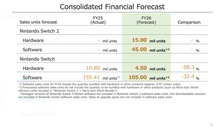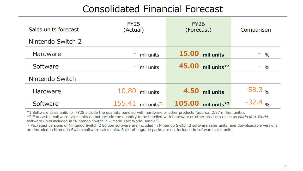 Um dos pontos principais dessa divulgação de ganhos e perdas da Nintendo no ano fiscal de 2025 foi a sua previsão para o futuro. A Nintendo diminuiu realizou 200 mil consoles Nintendo Switch a menos do que havia sido previsto, chegando a 10,80 milhões vendidos. A previsão para o próximo ano fiscal é de 4,5 milhões de unidades de console, o que dá menos da metade do ano fiscal recém finalizado.