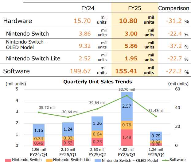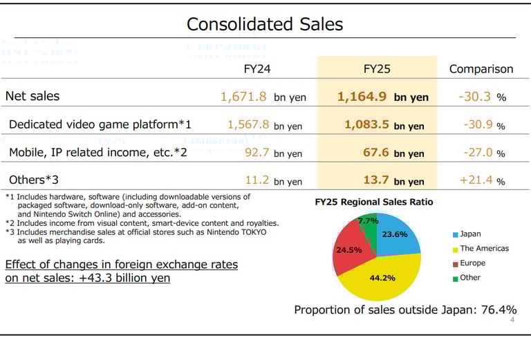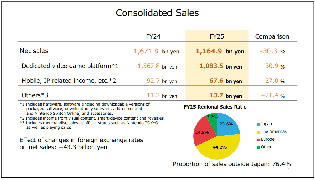 Em comparação com o mesmo período do ano passado (Abril de 2024 a Março de 2025), a Nintendo teve uma queda de vendas consolidadas de 30,3%.