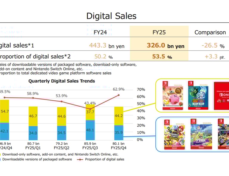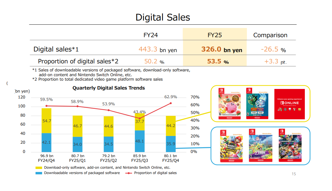 Os ganhos de vendas digitais tiveram uma queda de 26,5% no período. Mesmo as vendas num geral diminuindo, as vendas de produtos que apenas tem versão digital subiu 3.5%, impulsionado por jogos sem versão física, DLCs e assinatura do Nintendo Switch Online.