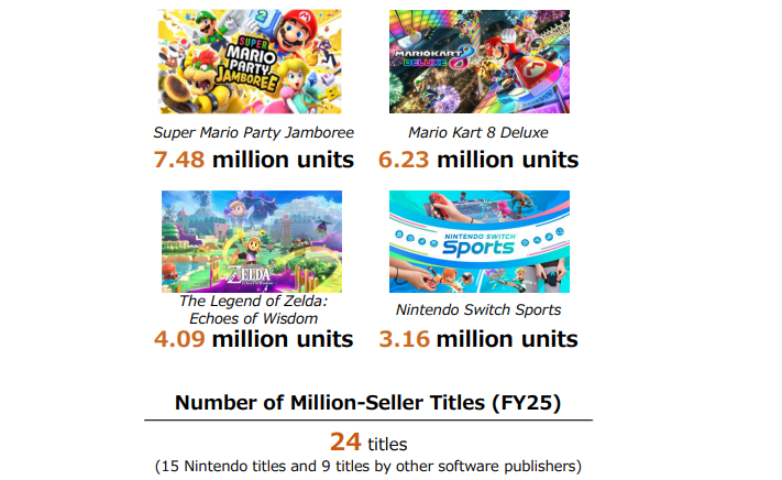 A venda de jogos teve uma queda total de 22,2%. Falando dos que venderam mais de um milhão de unidades nesse período, temos como destaque Super Mario Party Jamboree com 7.48 milhões de unidades vendidas no ano fiscal de 2025 e, em seguida, Mario Kart 8 Deluxe com 6.23 milhões.