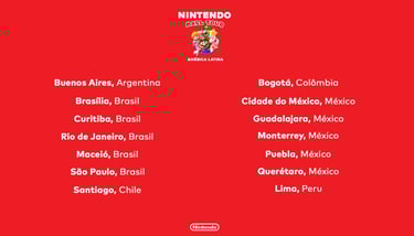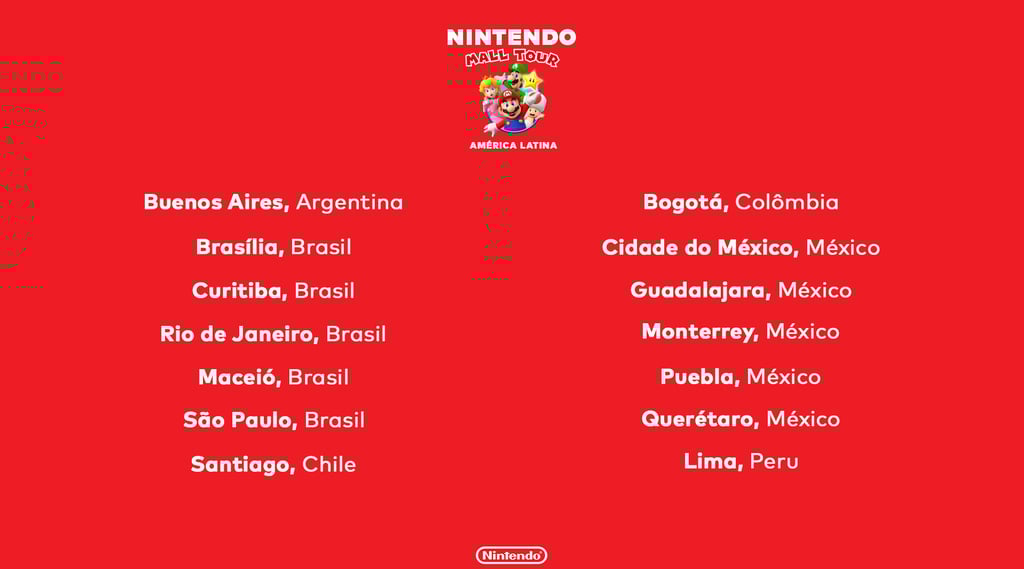 "Vocês estão prontos para passar as festas de fim de ano com a Nintendo? O Nintendo Mall Tour América Latina está chegando ao Brasil, Argentina, Chile, Colômbia, México e Peru! Você poderá experimentar jogos para os consoles Nintendo Switch 2 e Nintendo Switch. Fiquem ligados para saber mais detalhes como datas, horários e qual shopping irá representar cada cidade!"