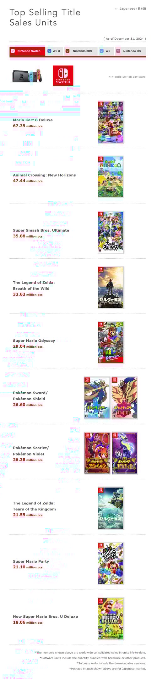 Foram 19 títulos que atingiram a meta de mais de um milhão, sendo 12 exclusivos da Nintendo e 7 de empresas parceiras (vendas contabilizadas entre Abril e Dezembro de 2024).