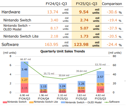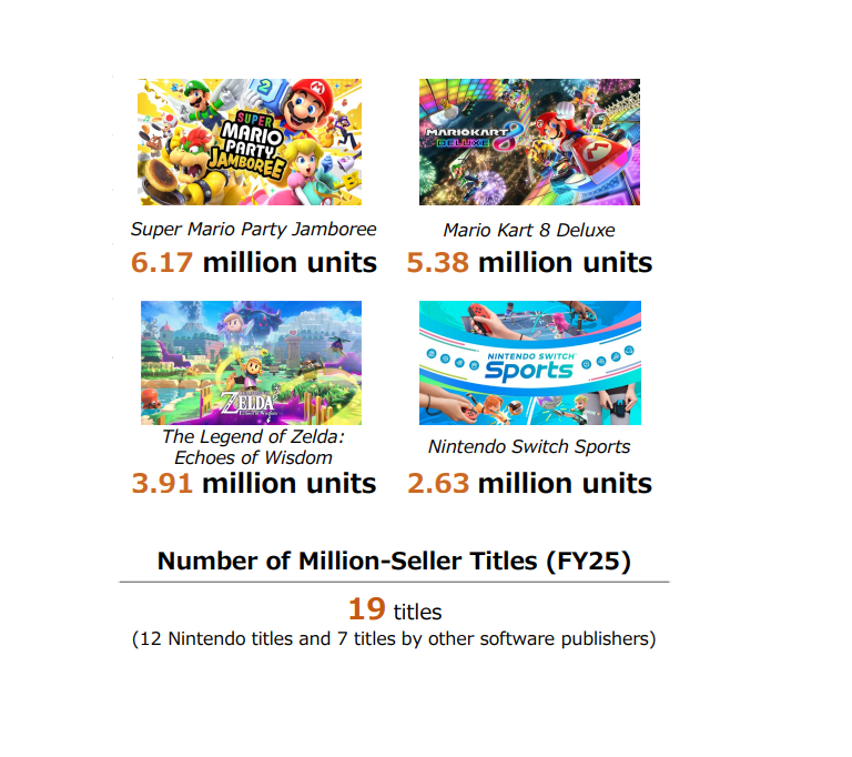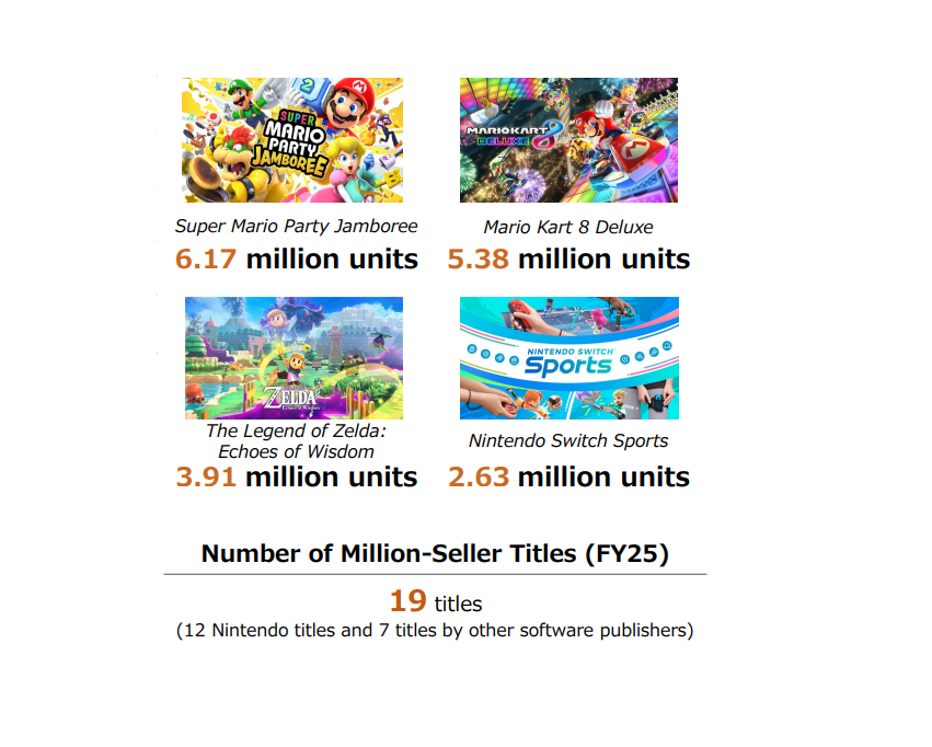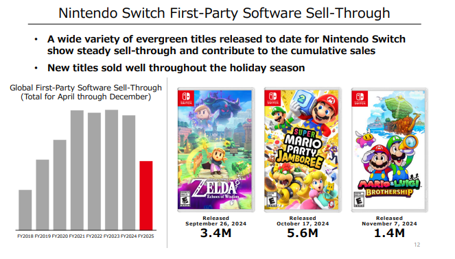 Nintendo destaca também a boa venda de seus novos jogos exclusivos no período do fim do ano, dando destaque a The Legend of Zelda: Echoes of Wisdom que vendeu 3.4 milhões de unidades, Super Mario Party Jamboree que vendeu 5.6 milhões de unidades e Mario & Luigi Brothership que vendeu 1.4 milhões de unidades.