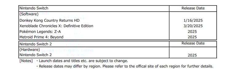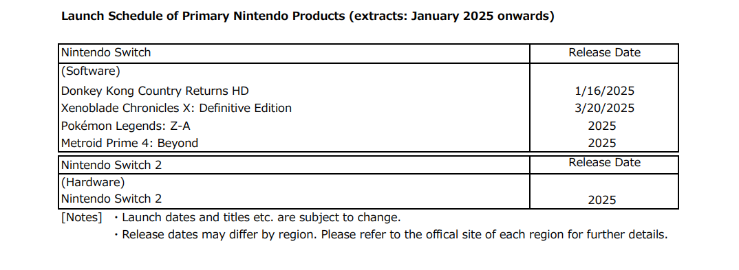 O calendário de lançamentos também foi atualizado, porém as datas são as mesmas já divulgadas anteriormente. Temos data confirmada apenas para Xenoblade Chronicles X: Definitive Edition para 20/03/2025 e se tratando de Pokemon Legends ZA, Metroid Prime 4: Beyond e o novo console Nintendo Switch 2, todos permanecem com apenas o ano de 2025 no calendário de lançamentos.