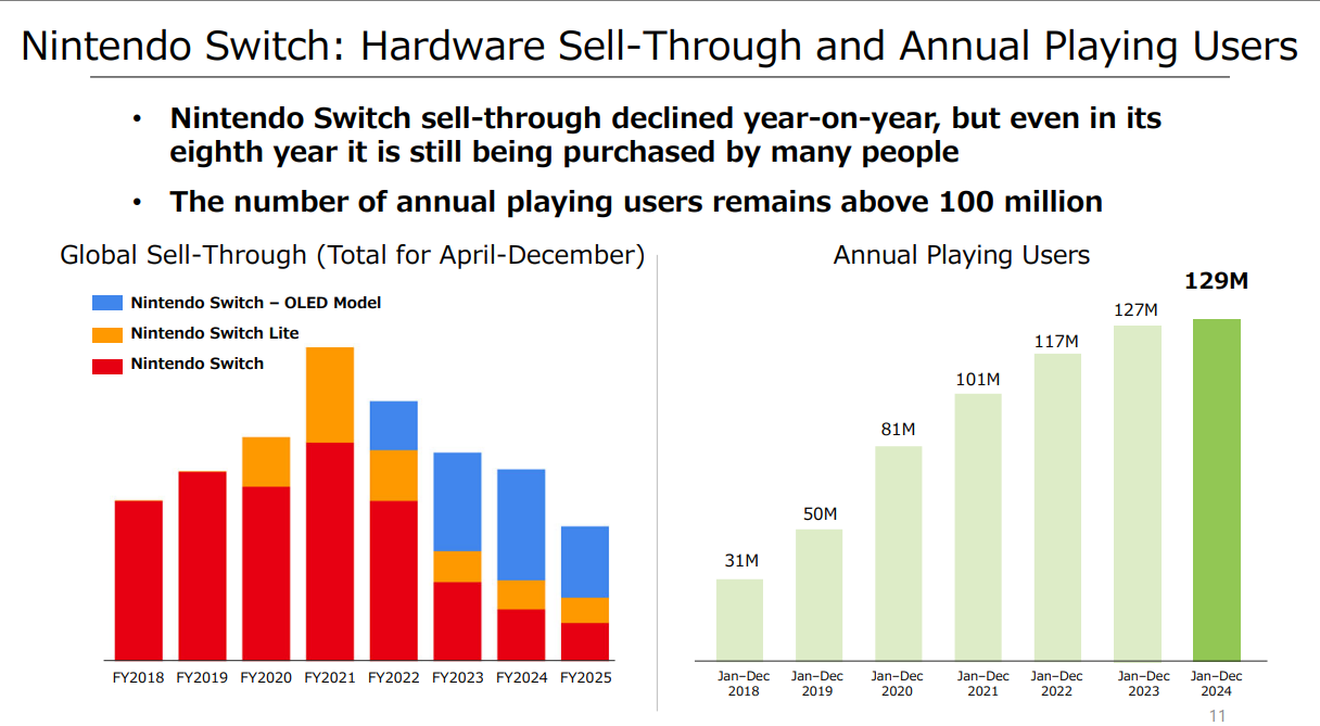 Se tratando de usuários ativos na plataforma, a Nintendo informou que foram mais de 129 milhões de jogadores que abriram algum jogo no Nintendo Switch no intervalo entre Janeiro e Dezembro de 2024.