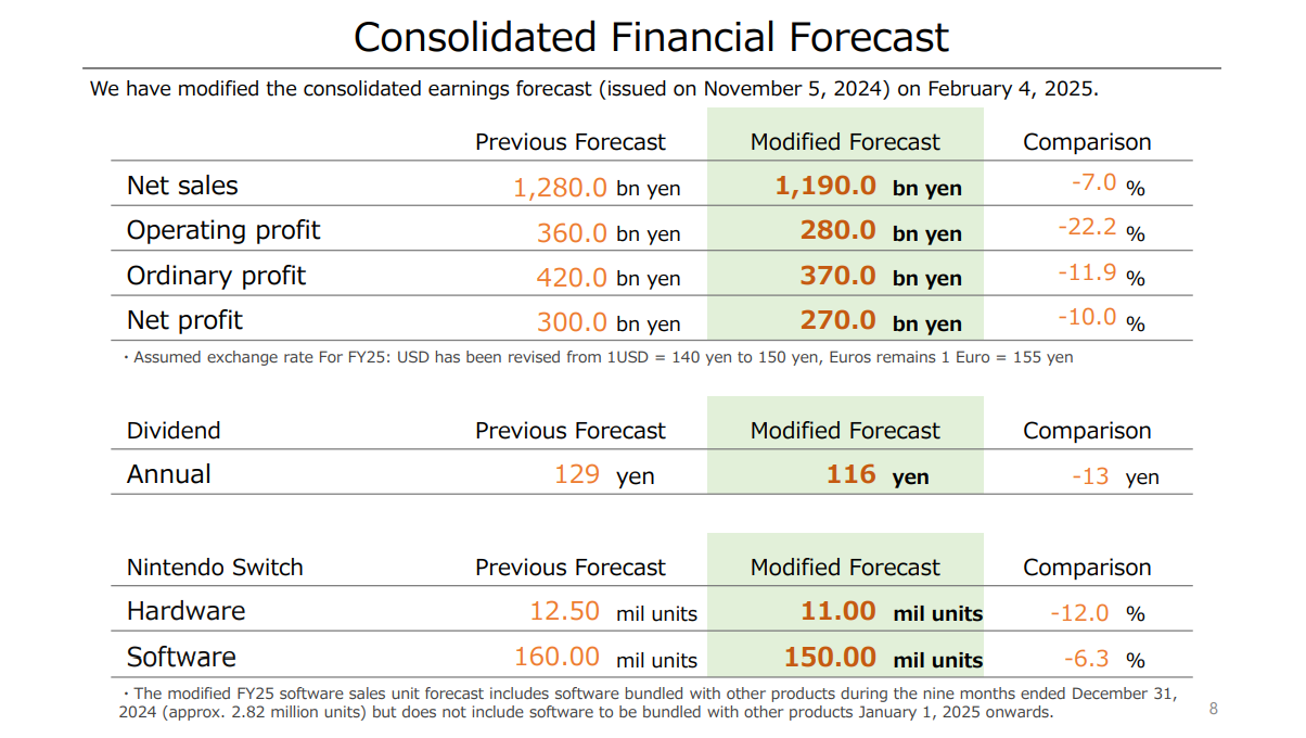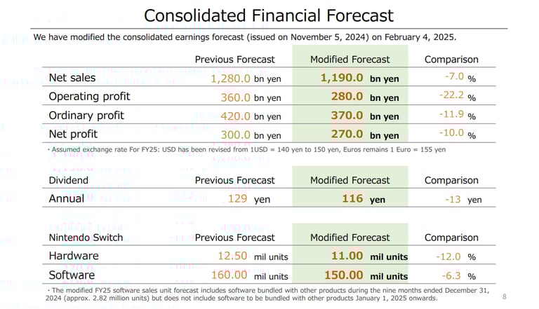 Um dos pontos principais dessa divulgação de ganhos e perdas da Nintendo nos últimos três trimestres do ano fiscal de 2025 foi a sua previsão para o futuro. A Nintendo diminuiu em 12% a previsão de vendas de consoles, saindo de 13,5 milhões de Nintendo Switch a serem vendidos de Abril de 2024 a Março de 2025 inicialmente, diminuindo no último relatório para 12.5 milhões e agora fazendo um novo reajuste para 11 milhões, totalizando mais 1,5 milhão a menos na previsão.