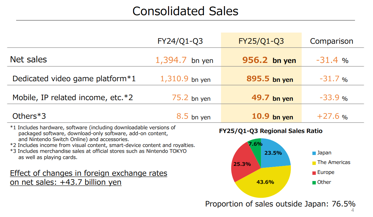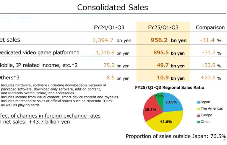 Em comparação com o mesmo período do ano passado (considerando os três primeiros trimestres de venda), a Nintendo teve uma queda de vendas consolidadas de 31%.