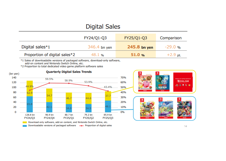 Os ganhos de vendas digitais tiveram uma queda de 29% no período. Mesmo as vendas num geral diminuindo, as vendas de produtos que apenas tem versão digital subiu 2.9%, impulsionado por jogos sem versão física, DLCs e assinatura do Nintendo Switch Online.
