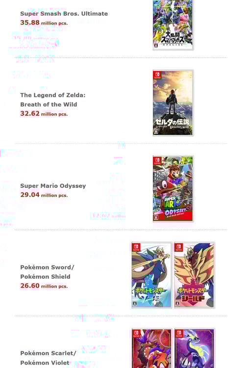 Falando dos jogos, o top 10 mais vendidos se manteve o mesmo, tendo todos na casa de, no mínimo, 18 milhões de unidades, sendo que o primeiro lugar, Mario Kart 8 Deluxe, alcançou a marca de 67 milhões de unidades vendidas somando mais de 3 milhões vendidos apenas no último trimestre.