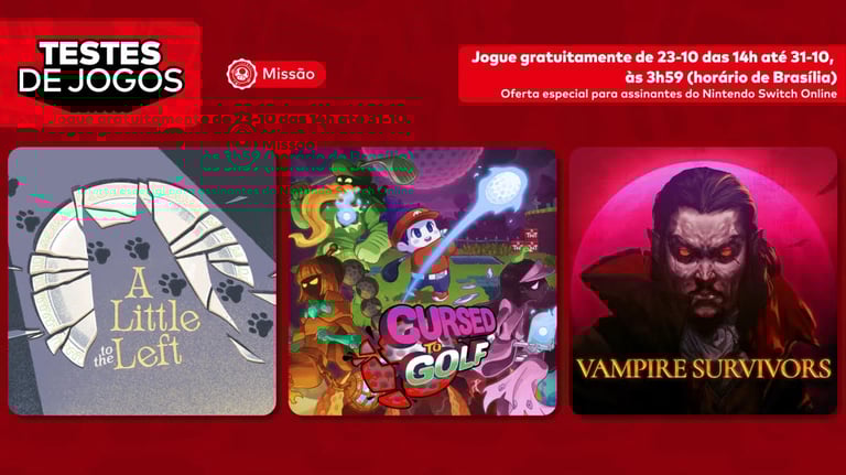 De 23/10, às 14h até 31/10, às 3h59 (horário de Brasília), assinantes do Nintendo Switch Online poderão baixar e experimentar os jogos A Little to the Left, Cursed to Golf e Vampire Survivors completos e sem nenhum custo adicional.