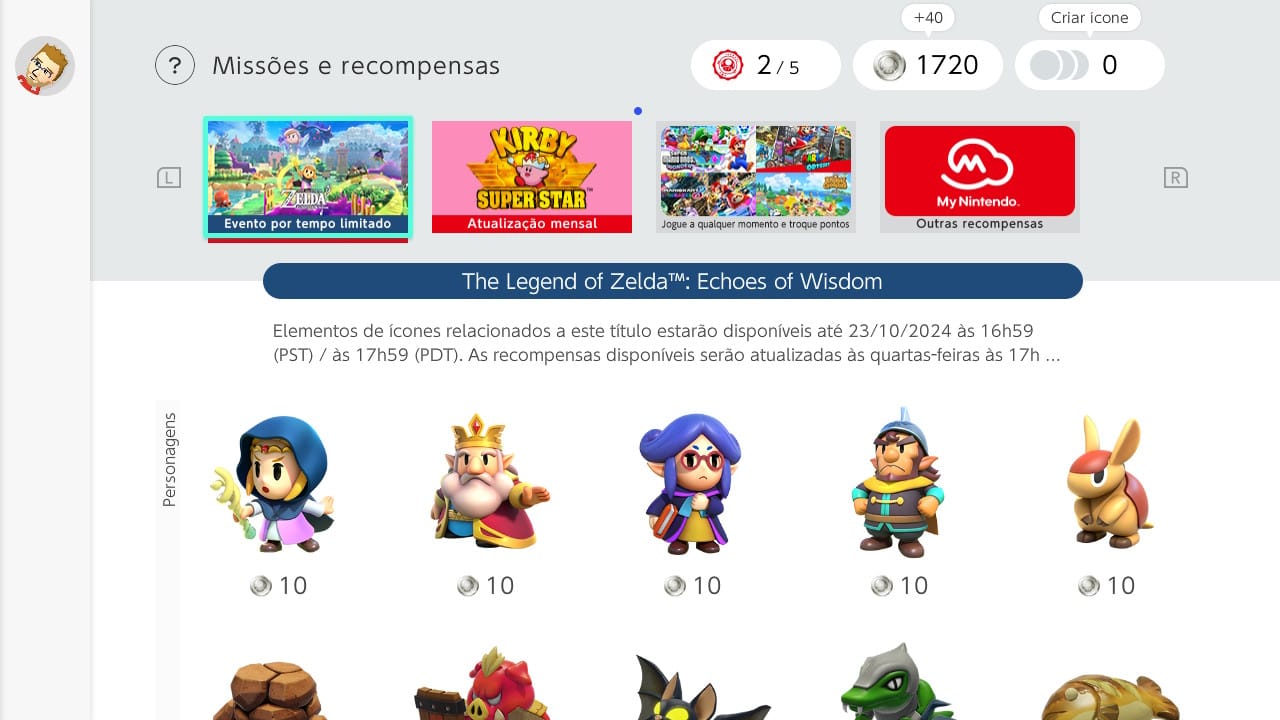 A parte 2 dos ícones já está disponível para baixar e ficará resgatável até dia 09 de Outubro de 2024. São oito personagens característicos do jogo, incluindo Rei de Hyrule, General Destral, Ministra Sestria e algumas criaturas, além de algumas molduras e fundos para resgate.