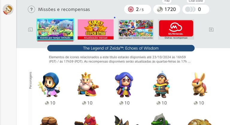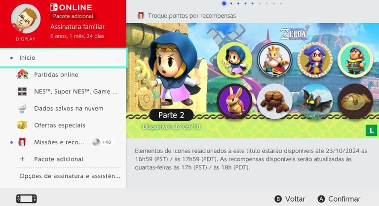 Para resgatar os ícones, basta acessar o APP do Nintendo Switch Online na tela principal de seu Nintendo Switch, acessar a opção 'Missões e Recompensas' e trocá-los por 10 moedas de platina para os personagens e 5 moedas de platina para fundos e molduras.